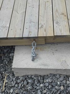 Landgången till badbryggan har varit helt lös! Vi säkrade den med kättingar till nya fästen i